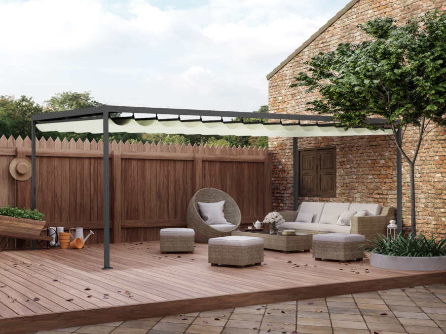 • Pergola NUUN FABRIC je terasové zastrešenie s látkovou strechou, ktorá poskytuje ochranu pred slnkom a dažďom. Hlavným ochranným prvkom je látková strecha vyrobená z vysoko odolnej tieniacej látky, ktorá sa pohybuje pomocou systému pások ovládaných manuálne šnúrkou. Produkt nemá žiadnu automatizáciu, vďaka čomu je spoľahlivý a ľahko sa používa.